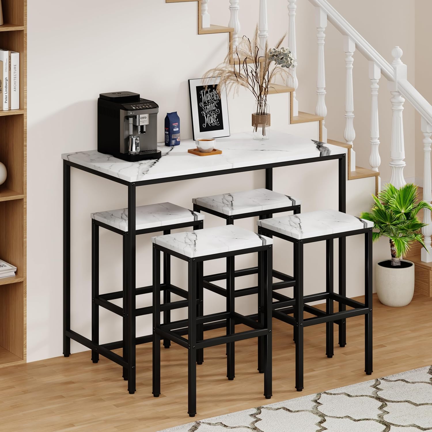 Yongchuang 5 Piece Bar Table Set, Kitchen Bar Table and Chairs Set of 4, Modern Metal Counter Height Table with Stools for Dining Room, Living Room Breakfast Table White Faux Marble Wood Top
